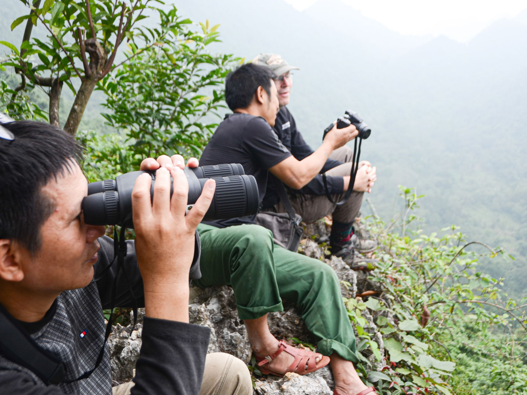 During the morning field visit, despite dense fog, the delegation was fortunate to observe at least three individual Delacour’s langurs. Along the patrol routes, the donor was introduced to the limestone forest ecosystem of Huong Son and highlighted endangered wildlife species recorded during regular forest patrols.