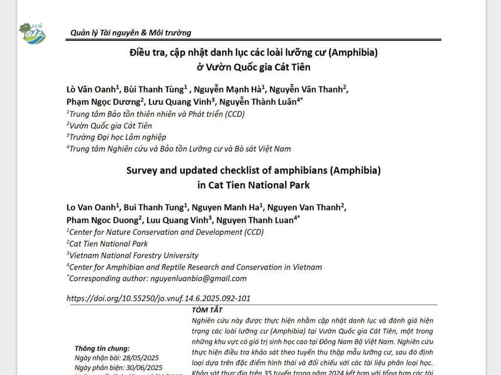 Vườn Quốc gia Cát Tiên (tỉnh Đồng Nai) là một trong những khu vực có giá trị sinh học cao nhất tại Đông Nam Bộ Việt Nam. Cát Tiên là ngôi nhà của nhiều loài động vật lưỡng cư – nhóm sinh vật nhạy cảm với biến động môi trường và có giá trị chỉ thị sinh thái cao.